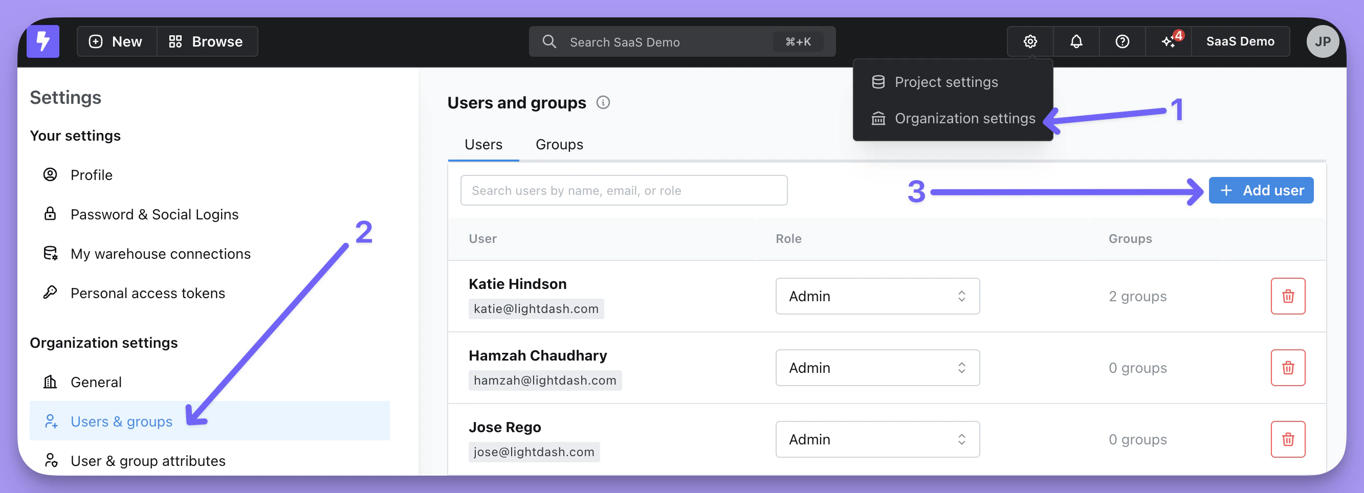 To invite your teammates individually, click on Organization settings —> Users & groups —> Add user.