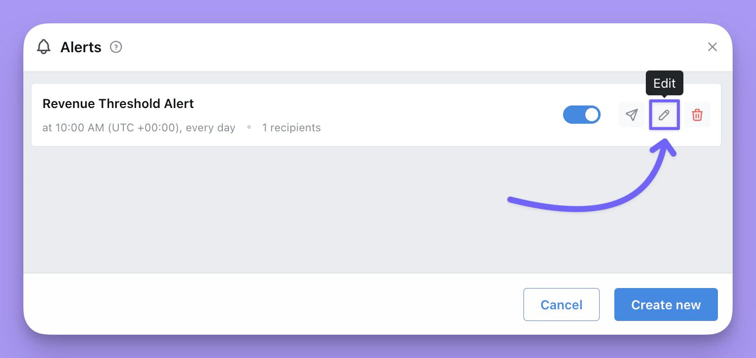 To edit an alert, click on the pencil-icon next to the alert you want to edit. This will bring you back to the configuration screen for your alert, where you can make any changes you’d like. In case you want to delete a alert, click on the trash-icon next to the alert you want to delete.