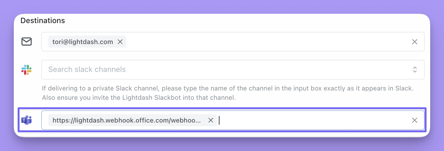 You can send your Lightdash alerts directly to Microsoft Teams using incoming webhooks. This allows you to keep your team updated with key metrics and reports, right inside your Teams channels.🔗 How to Create a Webhook in Teams