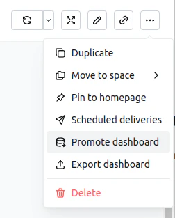 You can promote dashboards from the dashboard in view mode or from any listing (like home page or all dashboards), click on the ... button and then select promote dashboard. This will promote the dashboard to the upstream project as well as all the charts in this dashboard (for both charts within spaces and charts within this dashboard) and all other non-chart tiles like markdown. If the dashboard or charts are in a space that doesn’t exist in the upstream project, then these spaces will be created and the content will be put in these spaces.