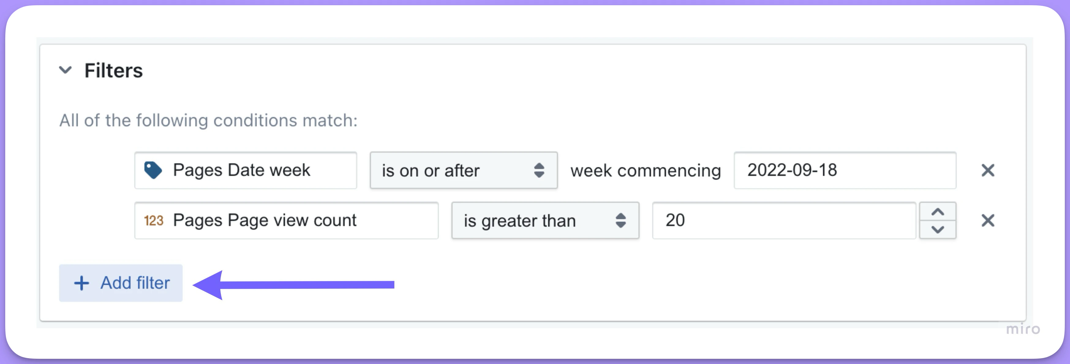 - Choose your filter operator and values as you would for any other filter.