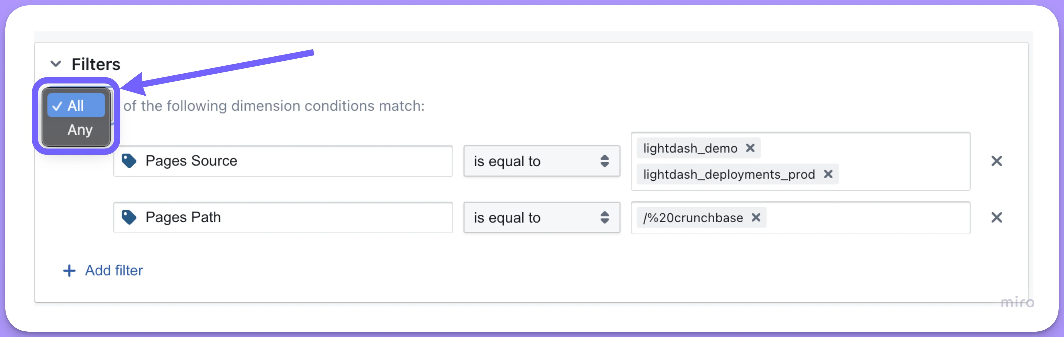If you add multiple filters, you can choose to have ALL or ANY of the conditions match