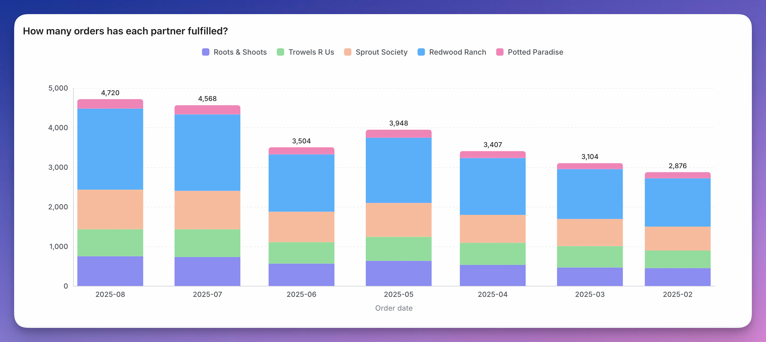 You can easily create 100% stacked bar charts easily by just selecting the 100% stacking option on the chart configuration. After enabling this option, we will automatically transform the data and the axes to display a 100% stacked bar chart. download.png 100% Stacked Bar Charts are useful when you need to visualize how the composition of a metric changes over time, or how the composition changes across different groups.