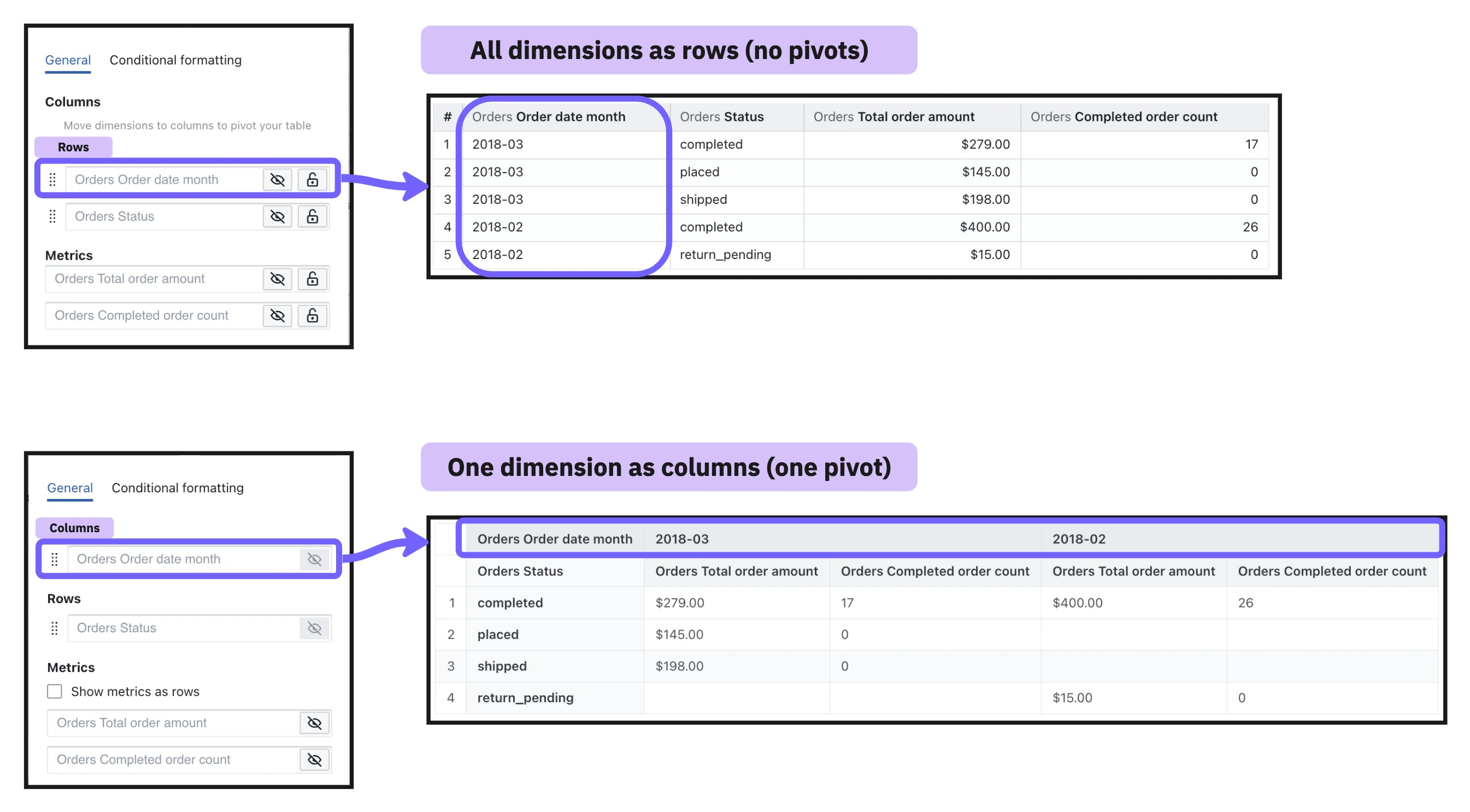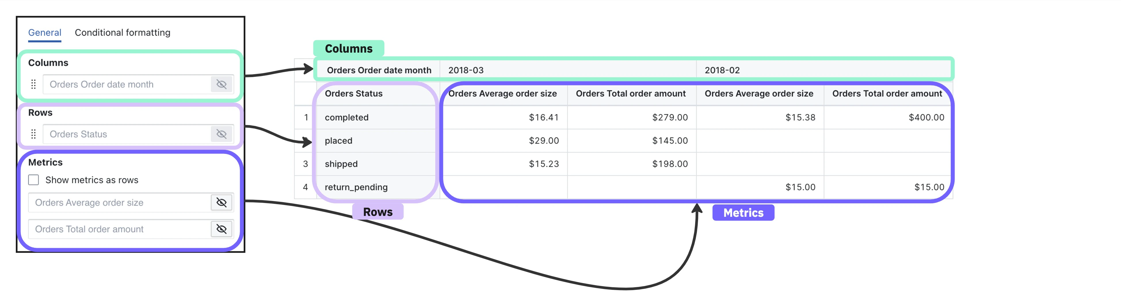 Here’s what a pivoted table looks like with order_date_month pivoted to columns and 3 metrics: Pivot column limit example If too many columns are generated as a result of your pivot configuration, you will see a warning that your results may be incomplete. This often happens when you pivot by multiple dimensions. For example, if you pivot by both order_date_month and browser (with 6 distinct values) and have 3 metrics, the maximum number of months displayed is: