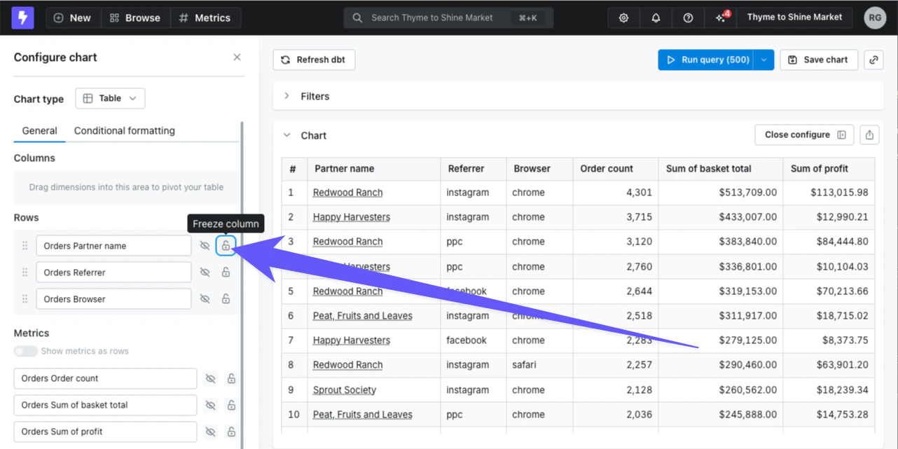 When you enable Show metrics as rows, each pivoted dimension value creates only one column, regardless of how many metrics you have. The metrics are displayed as separate rows instead. For example, if you have partner_name as a row dimension (with 5 partners), pivot by order_date_month (with 12 months of data), and have 3 metrics: