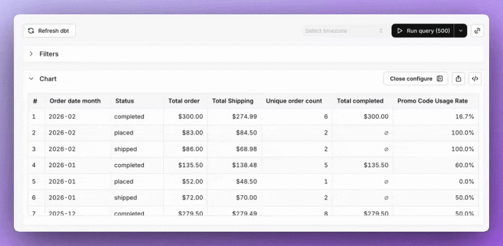 Sometimes it’s helpful to highlight certain values in your tables when they meet a specific condition. You can set up conditional formatting rules by going to the Configure tab, then Conditional Formatting.
