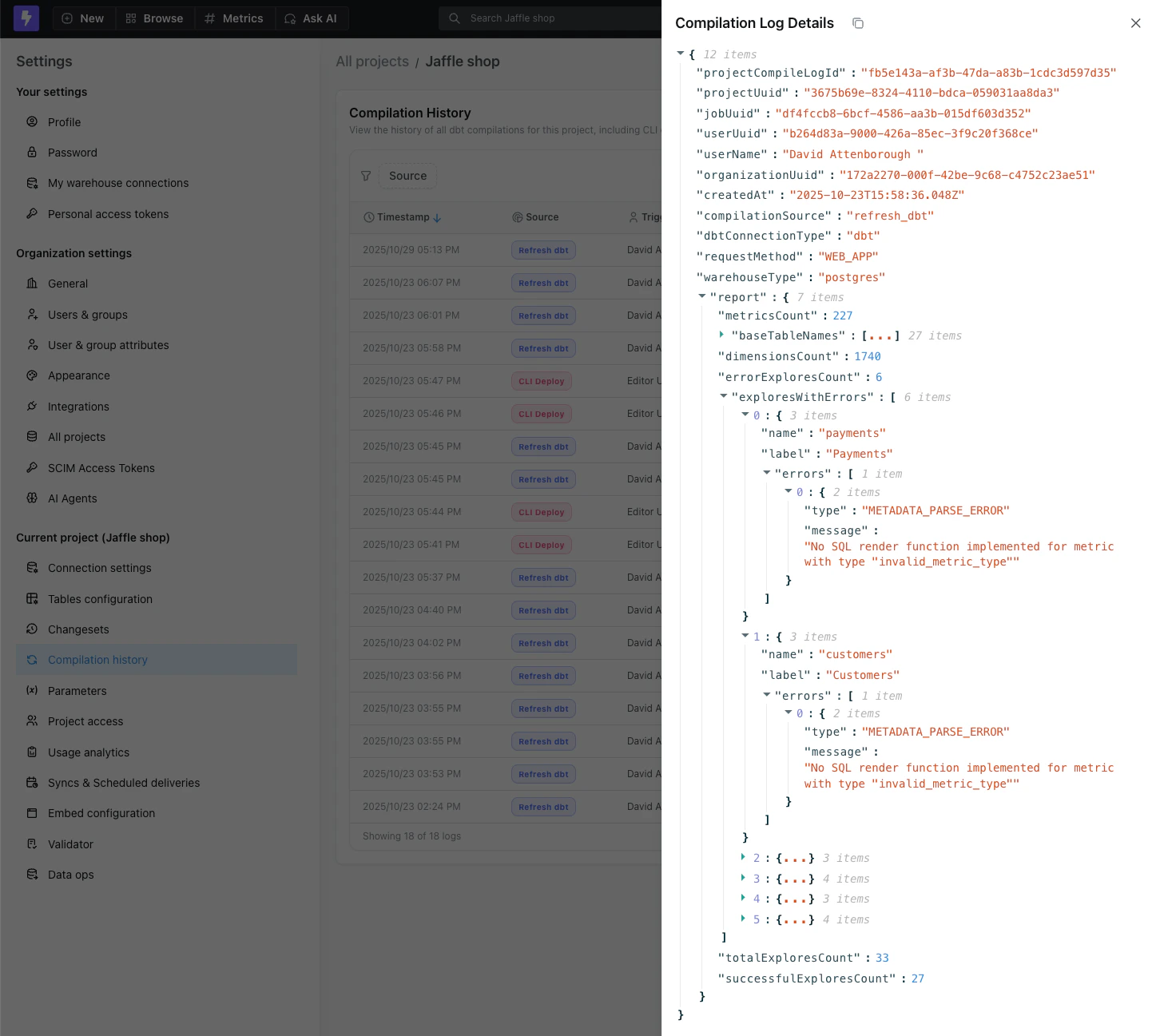 The compilation history displays a list of all project compilations, showing when each compilation occurred, who triggered it, and the source (such as Refresh dbt, CLI Deploy).
